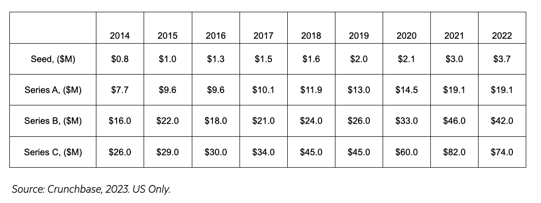 As a result, every single type of round, from Seed to Series C on, has also increased in size. Here are some averages over time: