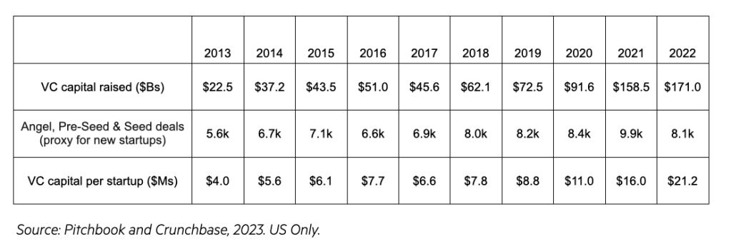 To gain visibility into this trend, we can examine the ratio of VC capital raised to new startups in any given year. An imperfect but close proxy for viable new startups is the annual number of Seed deals (inclusive of Angel, Pre-Seed, and Seed deals). When you take total VC dollars raised, divided by the number of new companies, you’ll see the average startup today has 5x more VC capital available than its counterpart did in 2013: